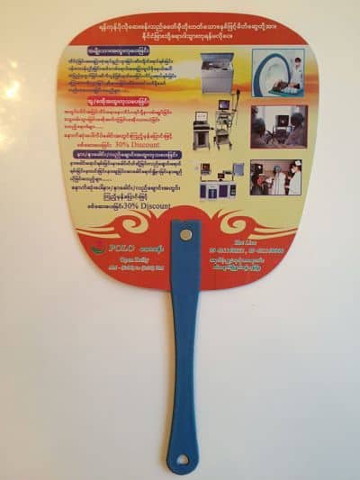 The seller noticed my curiosity and handed me one of the objects: The fan advertised vaginal ultrasounds and other examinations by means of high-end medical apparatuses for which a 30% discount was available … the monks and me continued our way through the criss-crossing streets of Yangon, cooling ourselves in the traditional way while advertising most modern technology.
